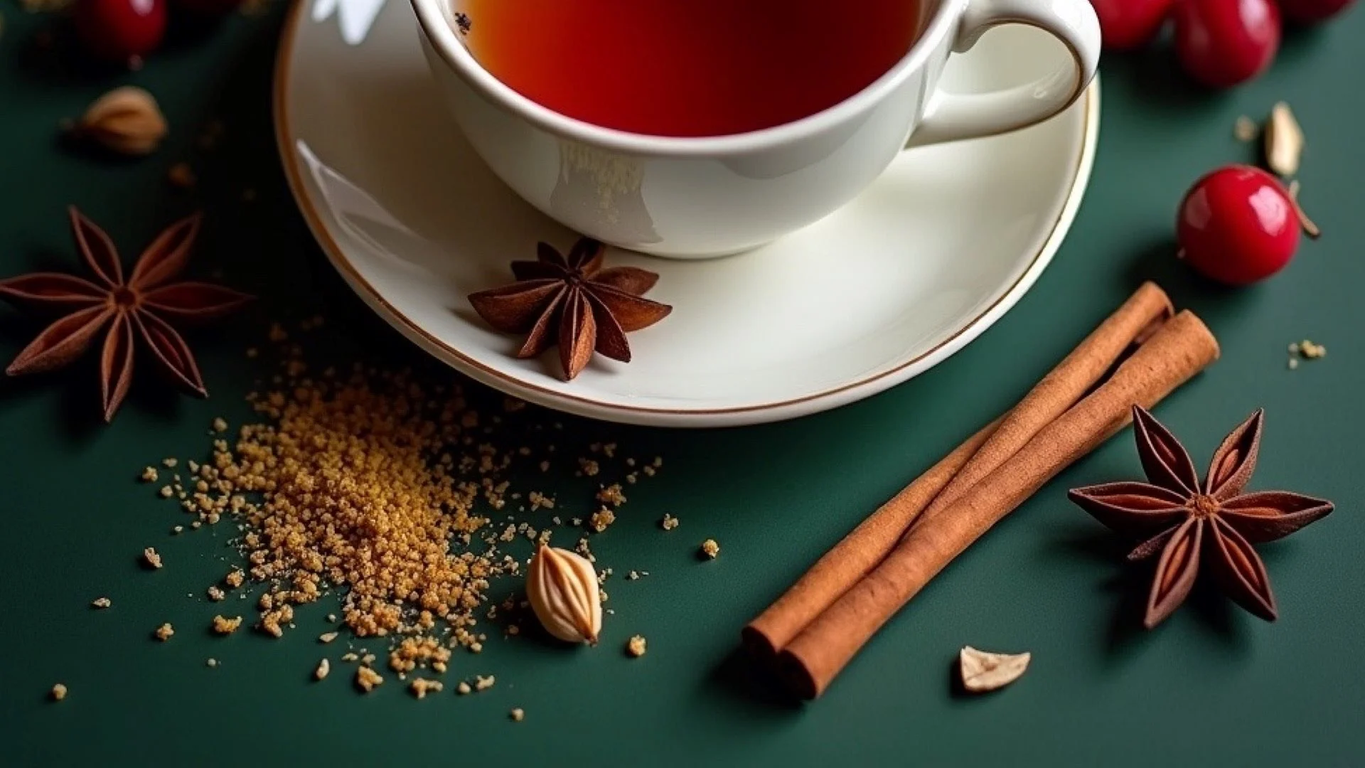 Christmas Tea Gift Box - A white teacup with tea and star anise, cinnamon, cardamom and red berries on a green background-Primo Artisan Coffee