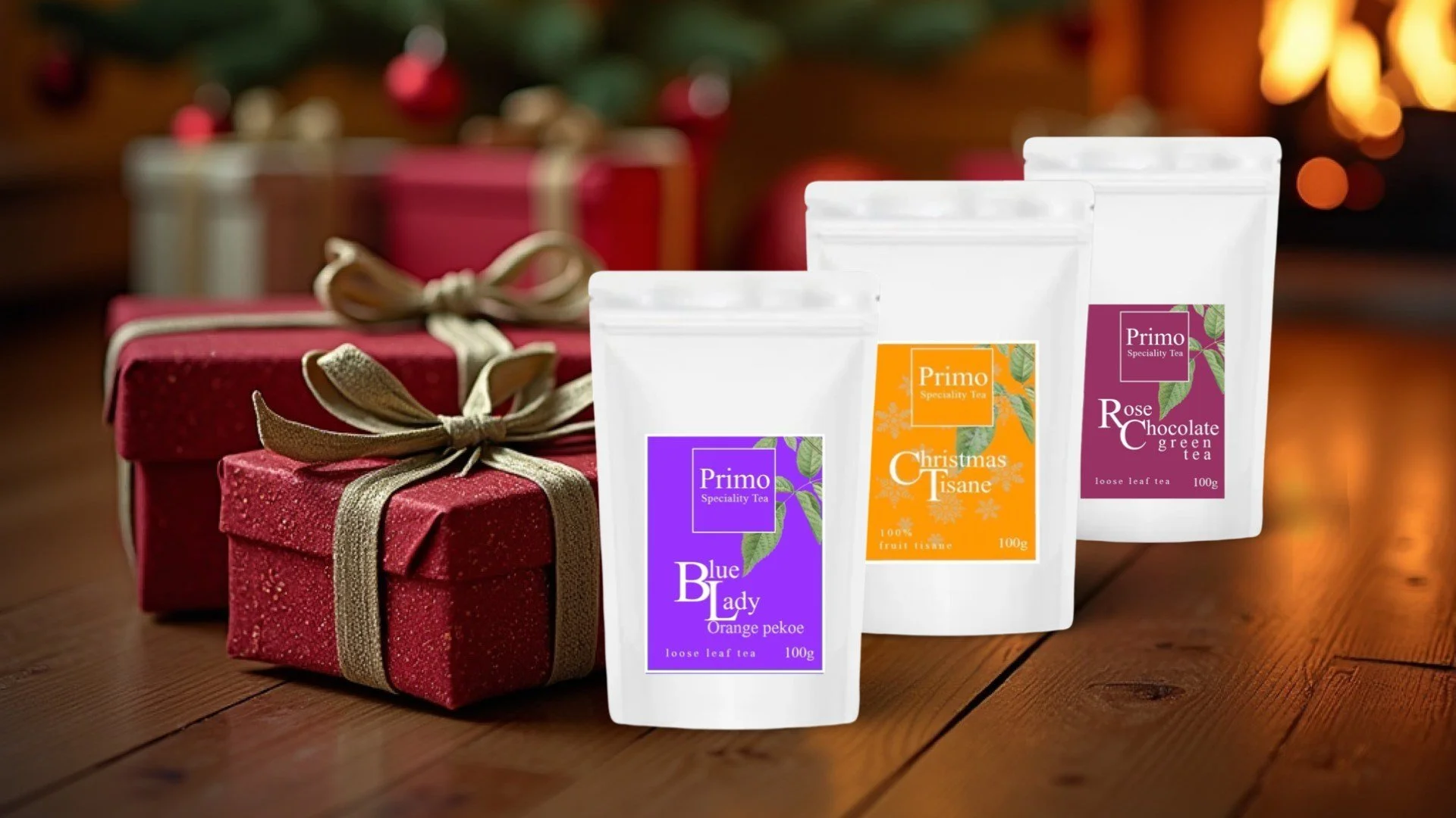 Christmas Tea Box-Three Pack with presents behind and christmas tree lights and a warm open fire in the background on a wooden floor-Primo Artisan Coffee