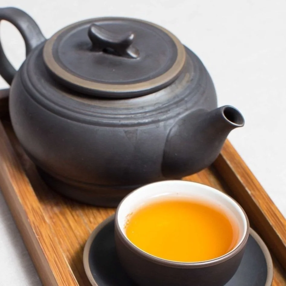 A Black Teapot and Teacup and saucer with a green tea in it, on a little wooden tray - Primo Artisan Coffee